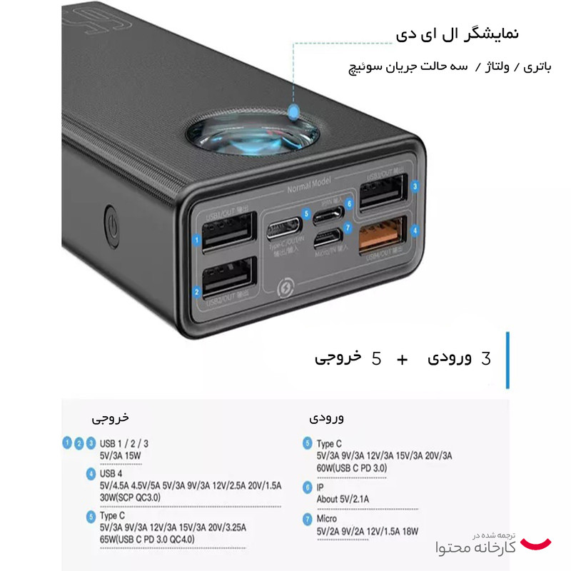 این پاوربانک دارای سه پورت ورودی شامل Micro USB، Type-C و Lightning است که امکان شارژ آسان و سریع را فراهم میآورد. همچنین، قابلیت شارژ همزمان ۵ دستگاه بهطور همزمان، آن را به انتخابی جذاب برای کاربران چند دستگاهی تبدیل کرده است.